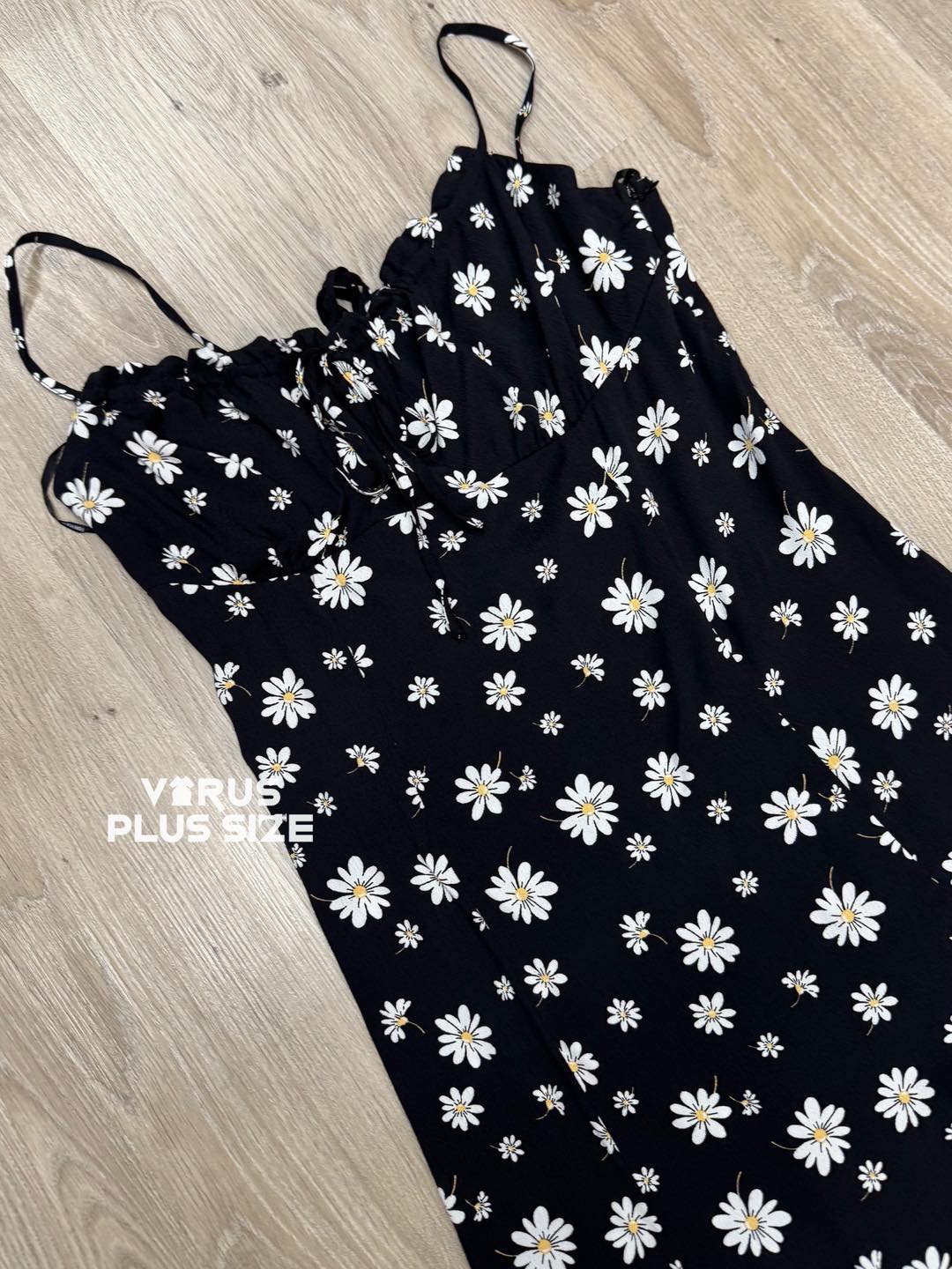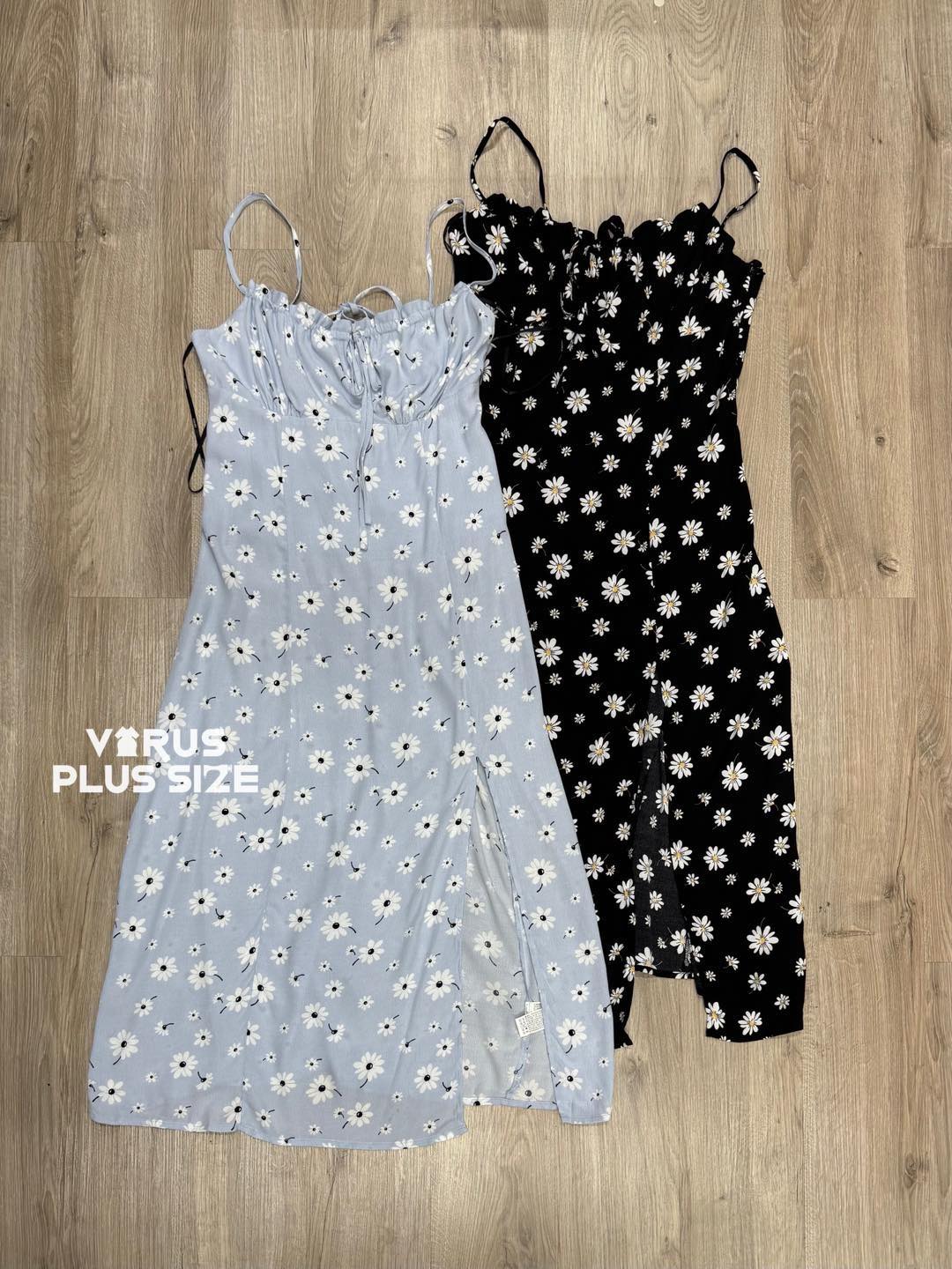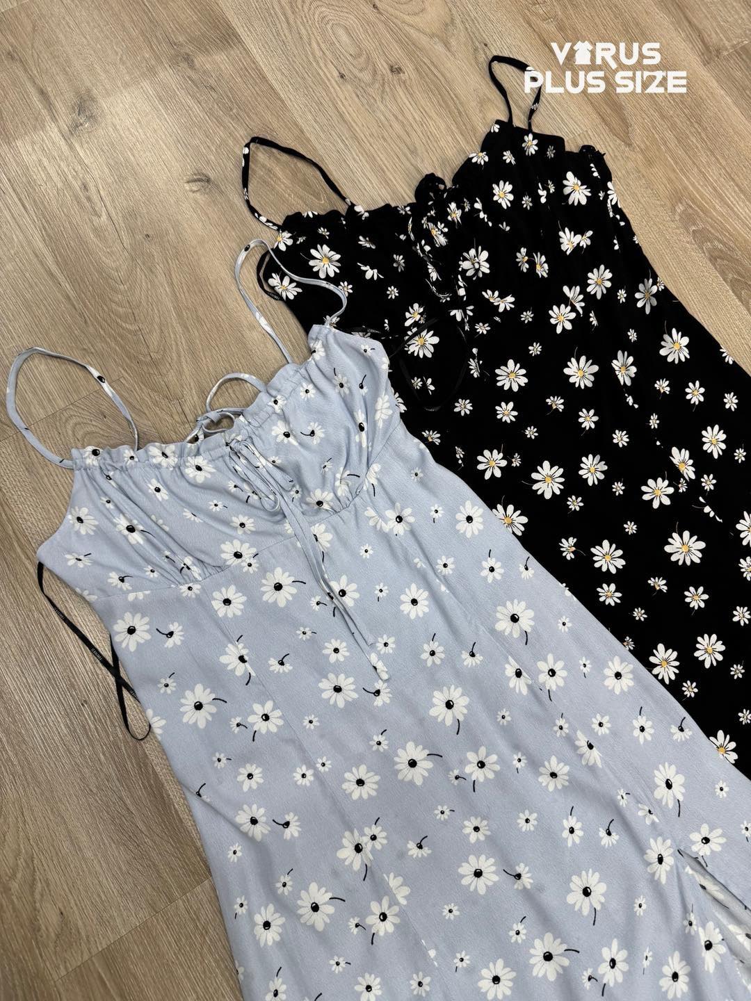 Chất rayon không co giãn, thiết kế dây thắt sau lưng dễ dàng điều chỉnh, phần ngực có dây rút thắt nơ tiểu thư, phối hoa nhí nữ tính. Bên trong có lót voan, form midi xẻ tà