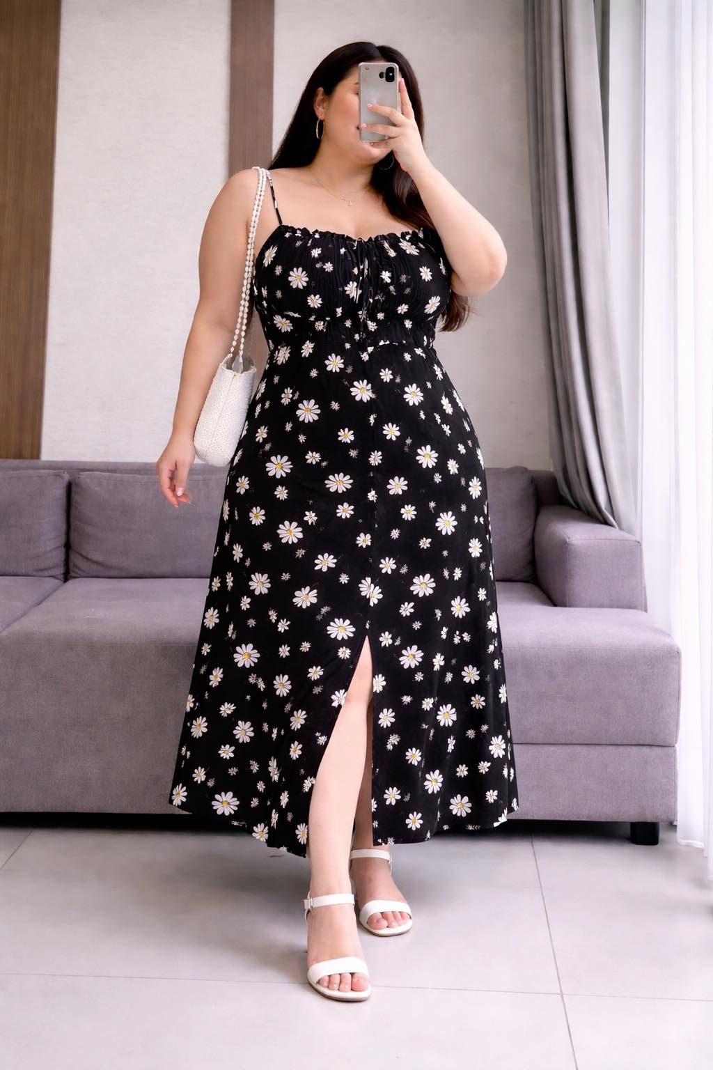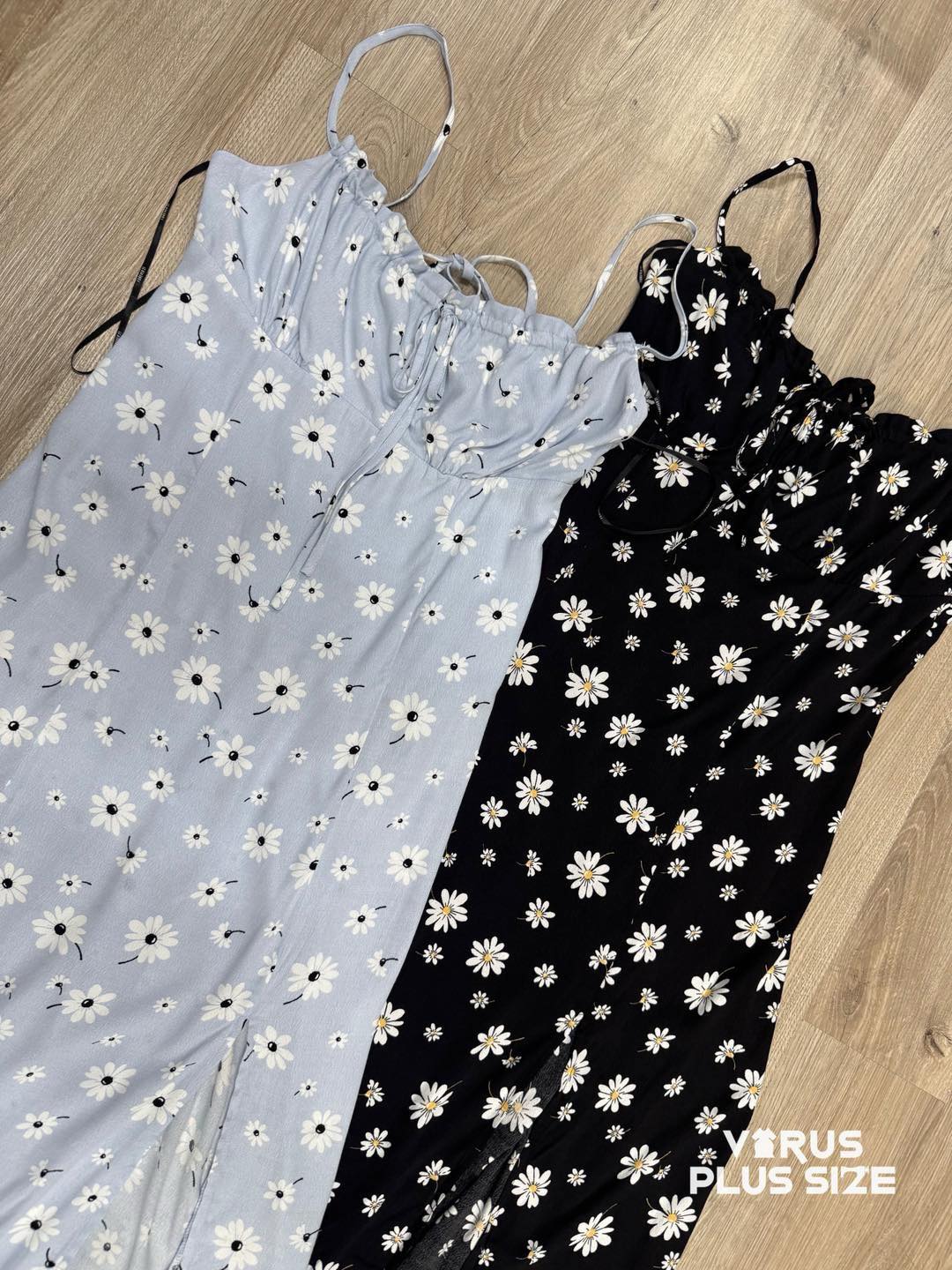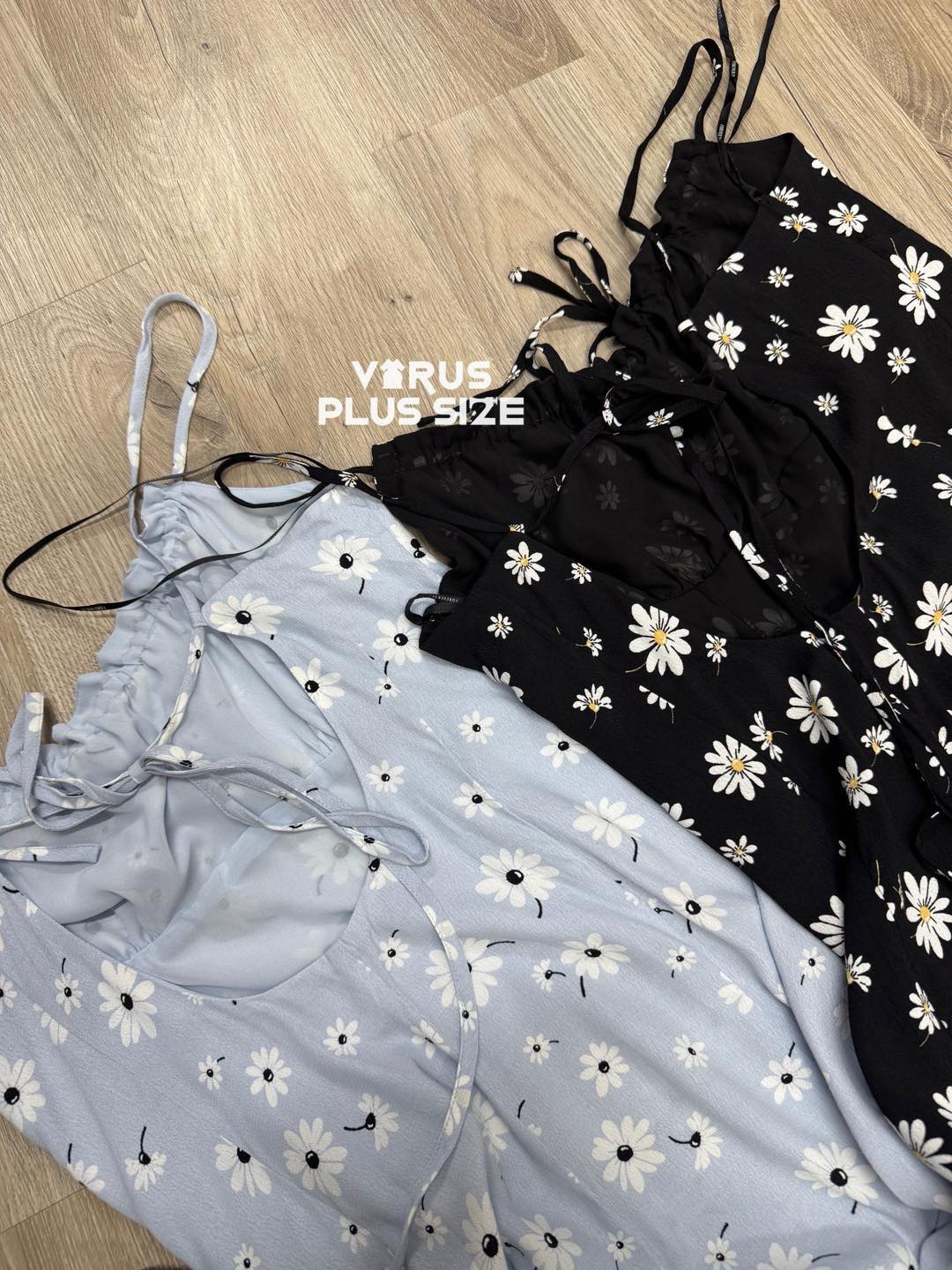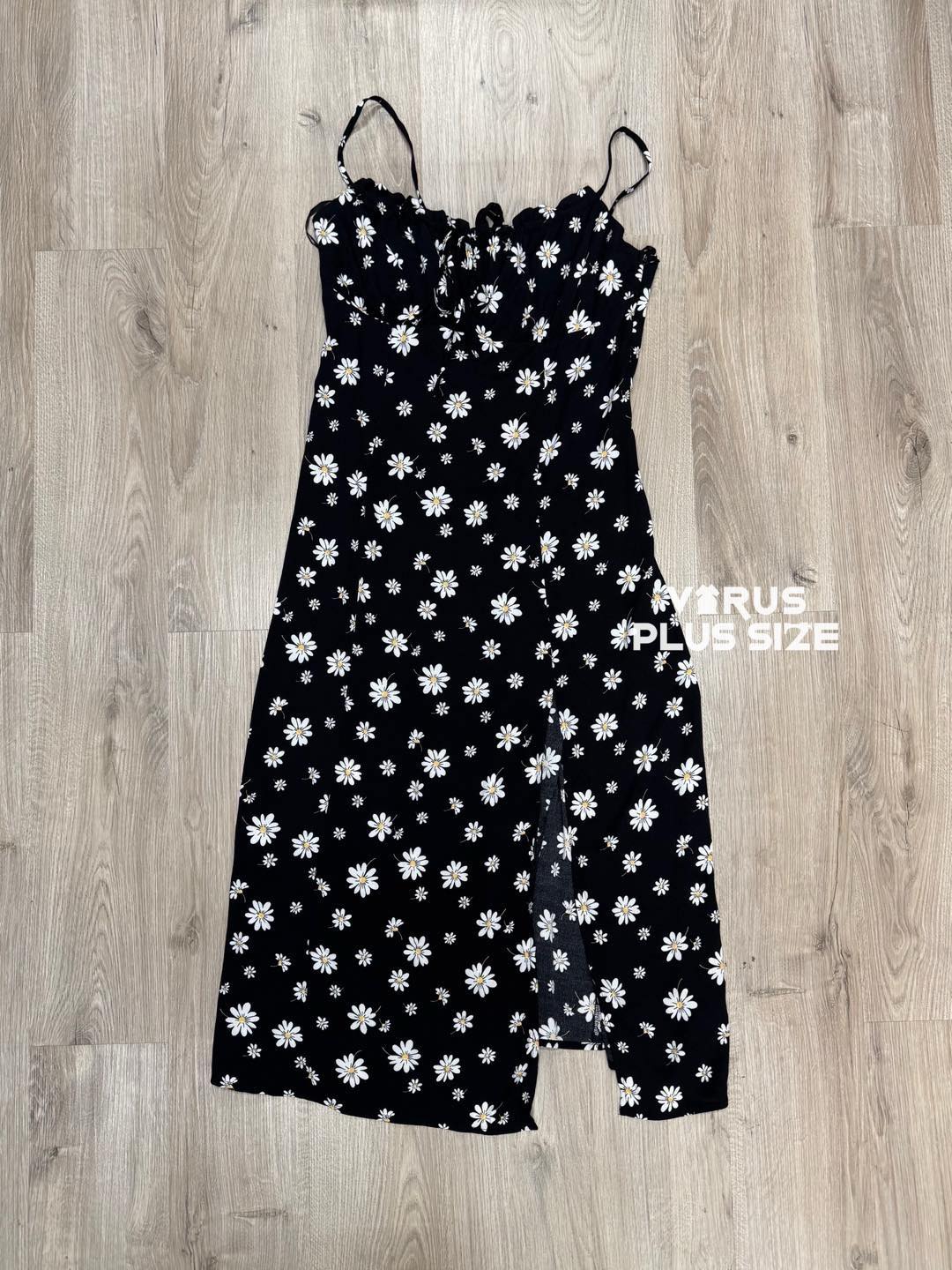 Chất rayon không co giãn, thiết kế dây thắt sau lưng dễ dàng điều chỉnh, phần ngực có dây rút thắt nơ tiểu thư, phối hoa nhí nữ tính. Bên trong có lót voan, form midi xẻ tà