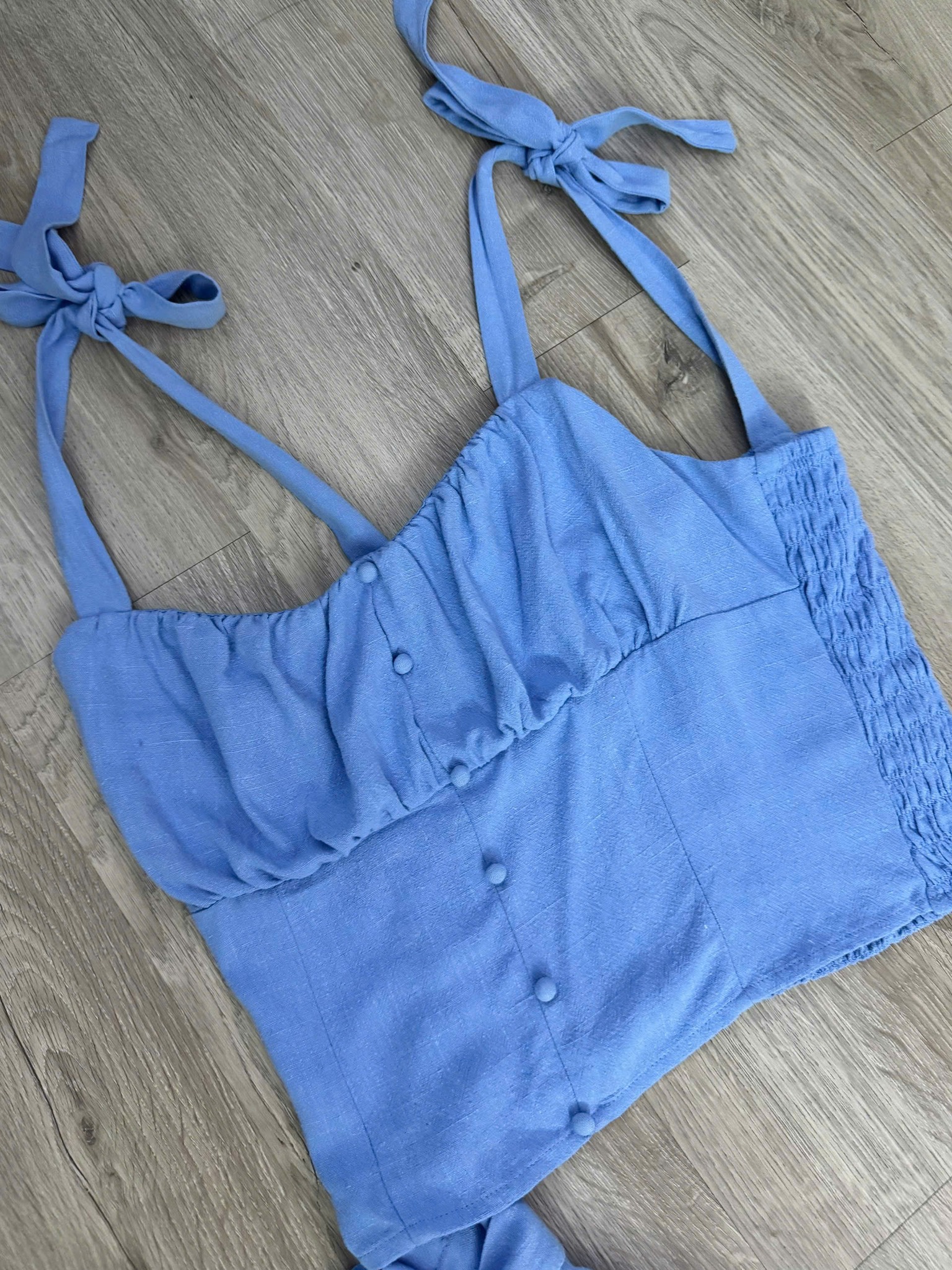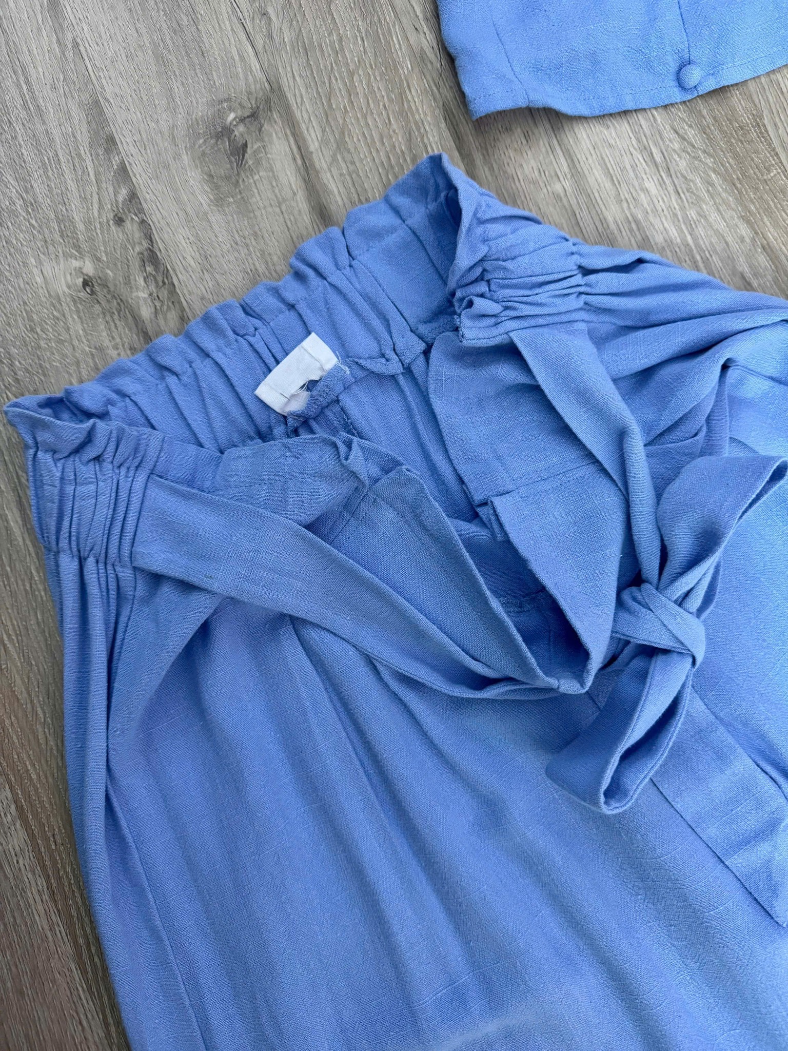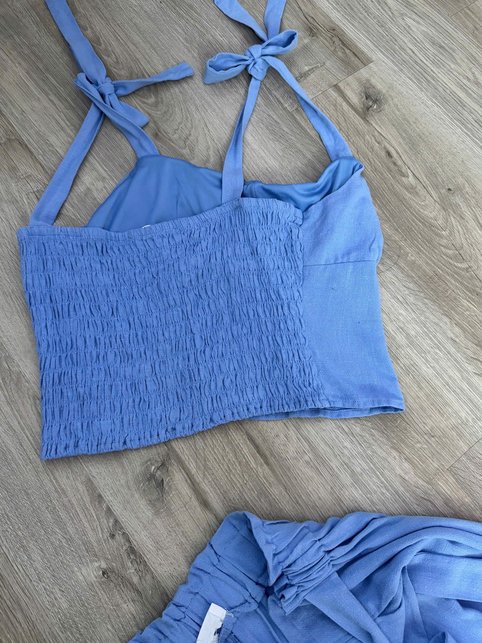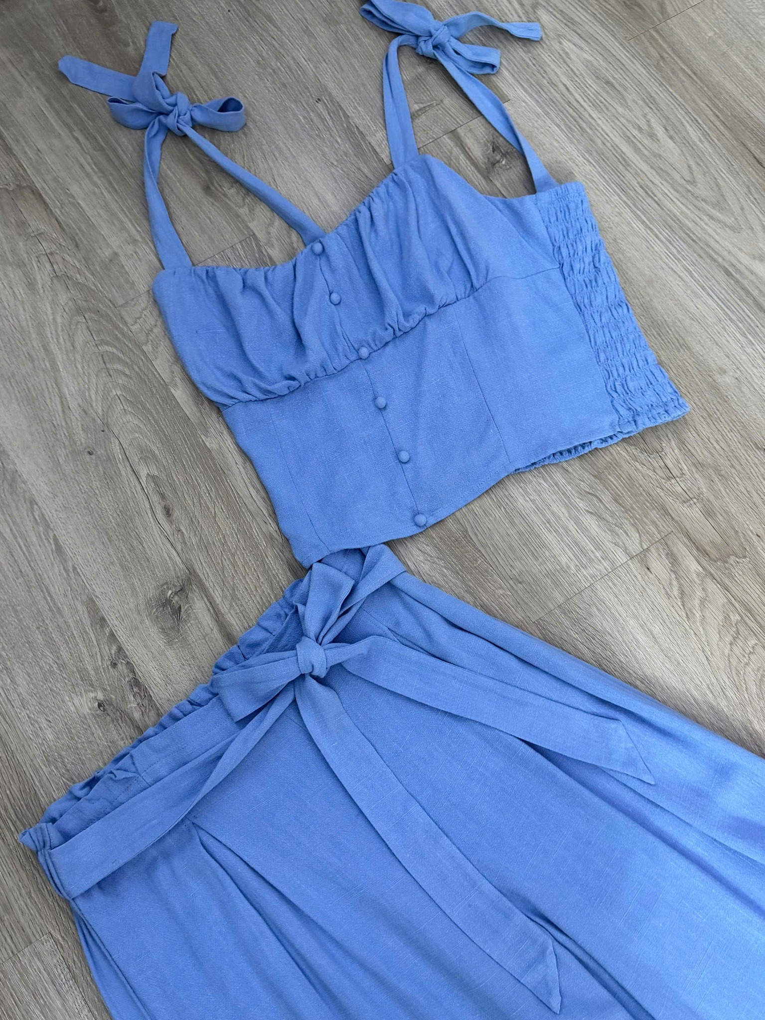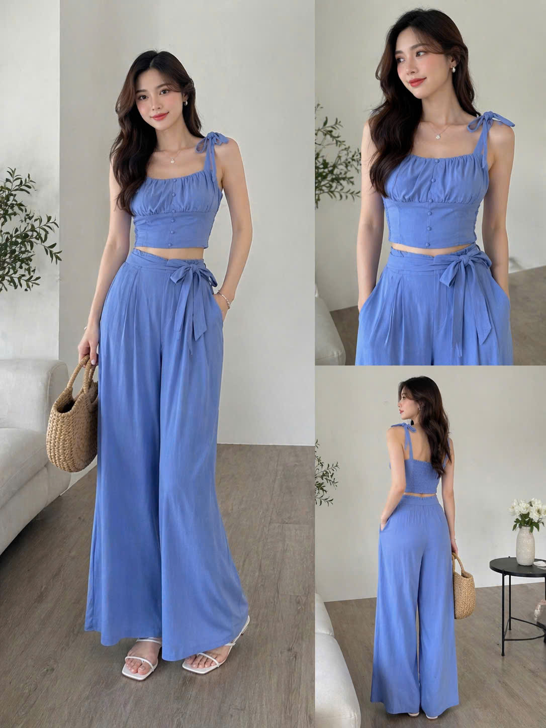 Áo dáng ôm nhẹ, nhún ngực nữ tính, dây nơ vai điều chỉnh xinh xắn, tôn dáng gọn gàng. Sau lưng mocking co giãn. Quần ống suông dài, cạp cao kèm dây buộc tạo điểm nhấn, giúp hack chiều cao hiệu quả.